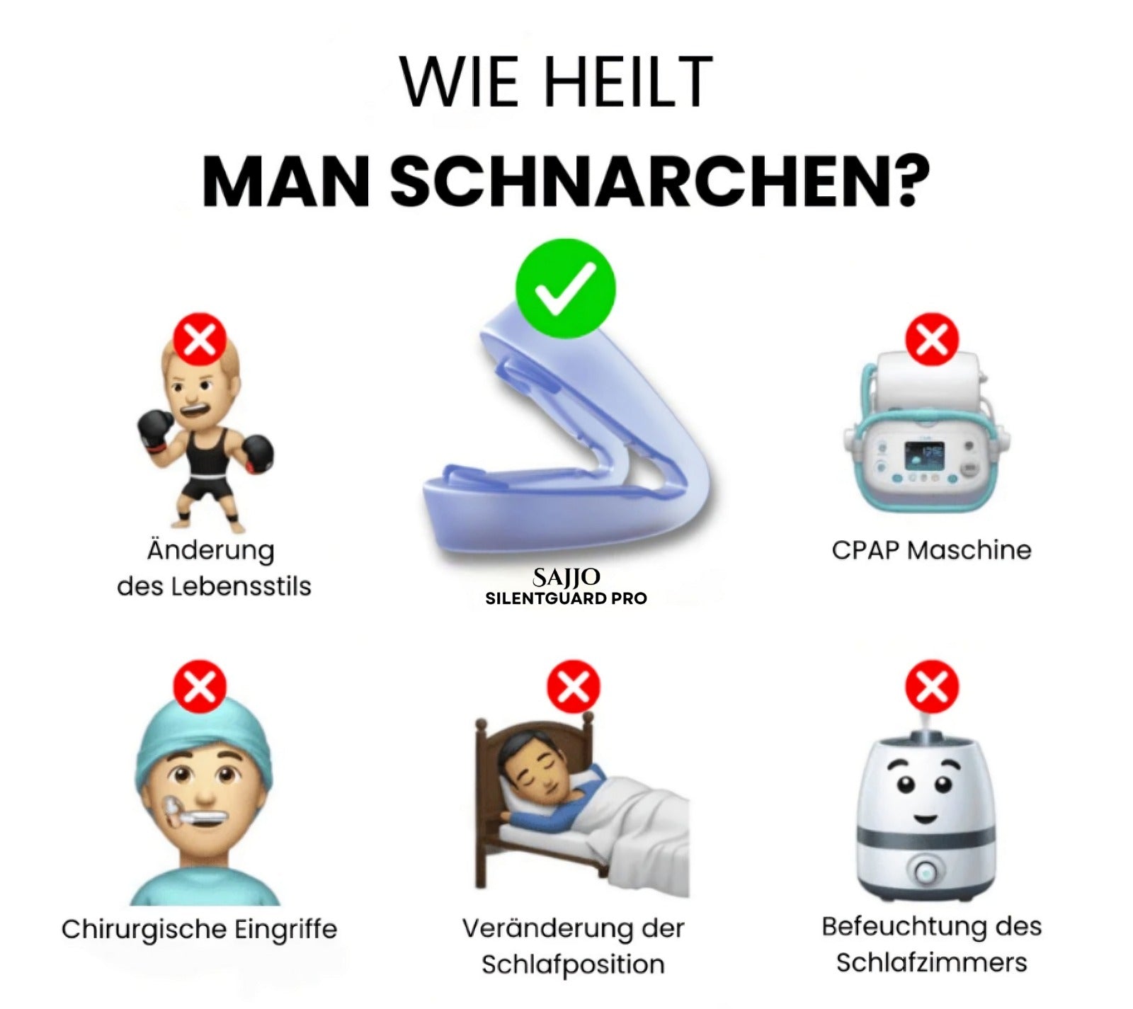 Der Sajjo SilentGuard positioniert deinen Unterkiefer sanft nach vorne, sodass die Atemwege während des Schlafs offen bleiben. Dadurch wird das Schnarchen deutlich reduziert. Im Gegensatz zu herkömmlichen Lösungen bietet Sajjo hohen Tragekomfort und erlaubt natürliche Mundbewegungen – für ruhige Nächte ohne Einschränkungen.